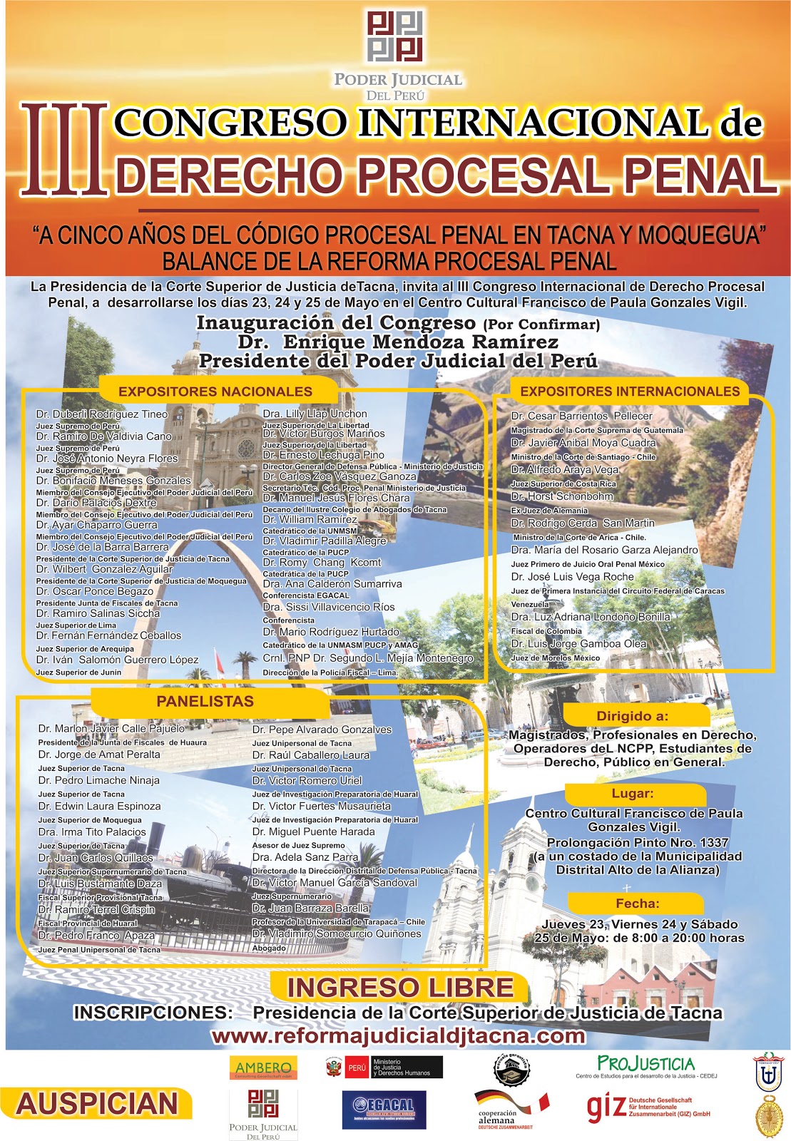 La Corte Superior de Justicia de Tacna - Presidente Jose Felipe de la Barra Barrera, la Corte Superior de Justicia de Moquegua - Presidente Wilbert Gonzales Aguilar y el Equipo Tecnico de Implementación del Nuevo Codigo Procesal Penal - Presidente Bonifacio Meneses Gonzales, han considerado conveniente promover el III Congreso Internacional de Derecho Procesal Penal, con la participación de destacados juristas tanto a nivel nacional como internacional, con el fin de dar a conocer los resultados de la aplicación del NCPP en dichas Cortes Superiores a dos años de vigencia.